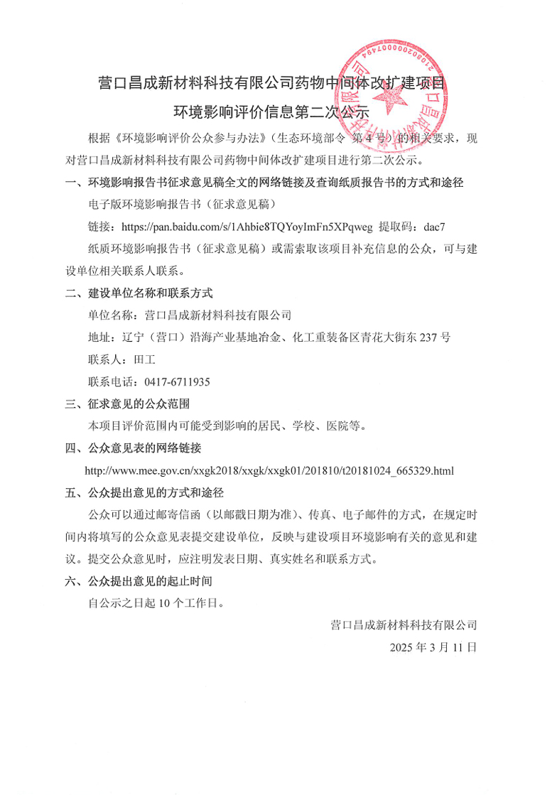 營口昌成新材料科技有限公司藥物中間體改擴(kuò)建項(xiàng)目環(huán)境影響評價信息第二次公司